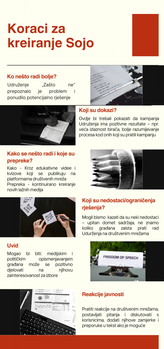 Novinari su priču fokusirali na edukativne videe koje objavljuje Udruženje „Zašto ne“ a u kojima se ukazuje na najčešće strategije političkog utjecaja na glasače. Na ovaj način, Udruženje pomaže građanima da bolje prepoznaju političke manipulacije i kritički valoriziraju izjave kandidata. Ovo je mali korak ka poboljašnju političke pismenosti građana, ali sjetimo se priče iz SAD-a s početka teksta, mali korak ka građanskoj jednakosti je i glasački listić na arapskom u jednoj američkoj državi. Upravo na ovakve male, ali vrijedne promjene računa solutions novinarstvo.