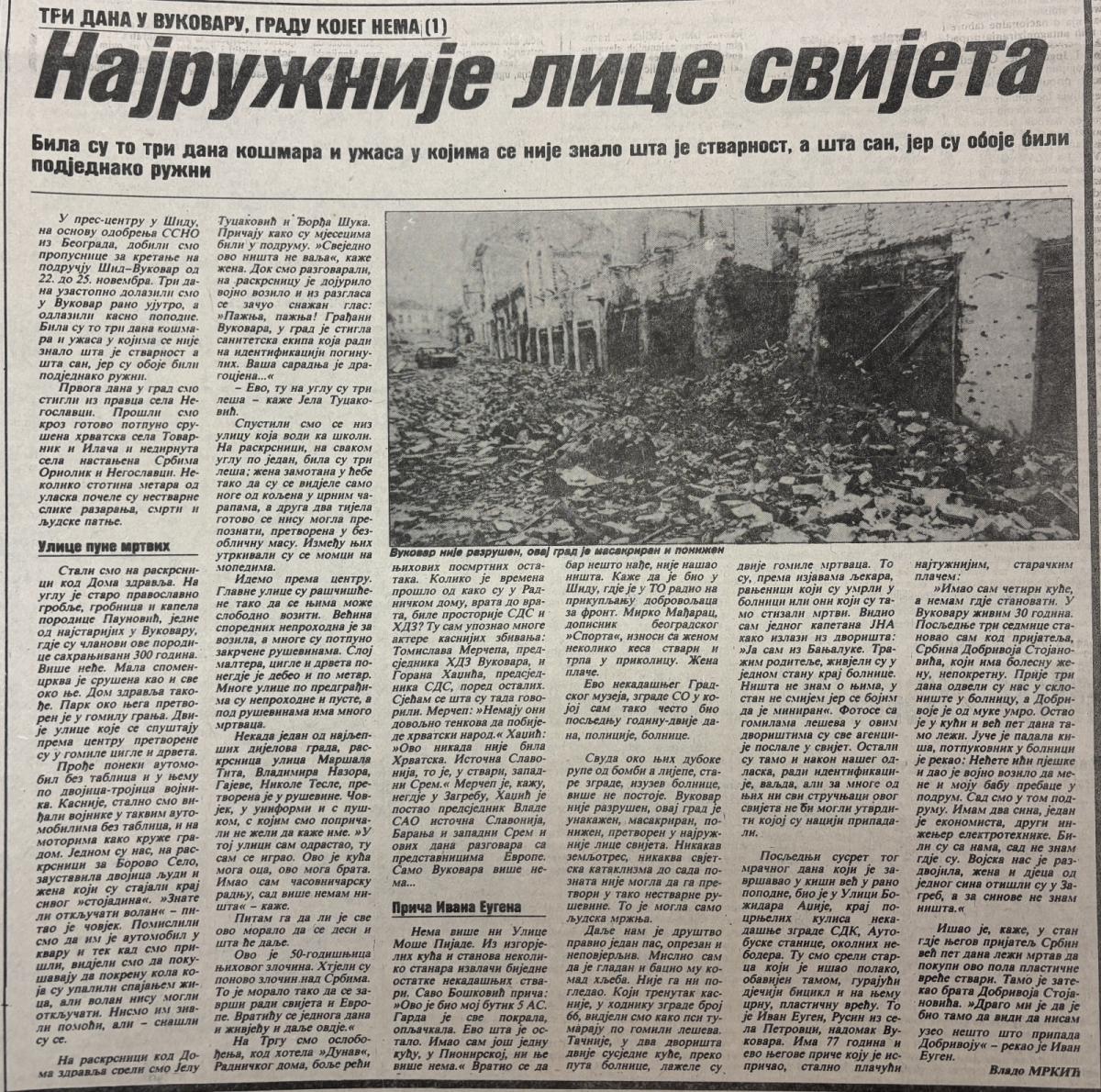 „Vukovar nije razrušen, ovaj grad je unakažen, masakriran, ponižen, pretvoren u najružnije lice svijeta. Nikakav zemljotres, nikakva svjetska kataklizma do sada poznata nije mogla da ga pretvori u tako nestvarne ruševine. To je mogla samo ljudska mržnja“, piše Mrkić.