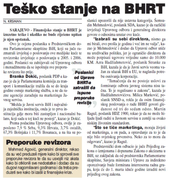 Digitalni arhiv „Infobiro“ podsjetio je, ovom prilikom, na mnoge naslovnice i članke u digitaliziranim novinama koje čuva i u kojima se više od dvije decenije upozorava na probleme u kojima se BHRT nalazi.