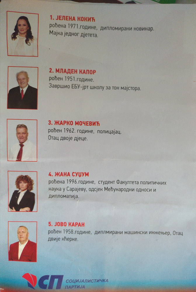 I nositeljica liste Socijalističke partije za Skupštinu Opštine Istočna Ilidža Jelena Kokić smatra da je roditeljstvo bitan odraz kompetencija. U njenoj biografiji piše da je rođena 1971. godine, da je diplomirani novinar i majka jednog djeteta. Pojašnjava da forma flajera zahtijeva kratke i šture rečenice, a da se više o kandidatima sazna i govori u predizbornim skupovima „kojih sada i ima i nema, ali tu su društvene mreže pa se može malo podobnije ispričati o svakom ponešto“.