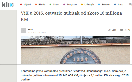 Da komunalna preduzeća mogu da posluju pozitivno nalazimo u primjeru zeničkog Vodovoda koji je 2015. godinu zaključio sa dobitkom od 2.1 milion KM.