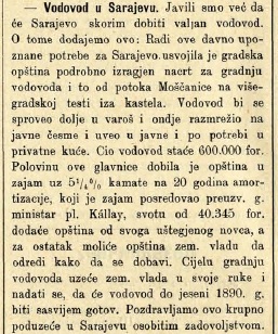 godine obavještava svoje čitaoce da će Sarajevo dobiti valjan vodovod. U članku još možemo pročitati da je tadašnja gradska opština usvojila nacrt za izgradnju vodovoda. Vodovod je izgrađen od potoka Mošćanice prema Sarajevu. Voda je prvo potekla na javnim česmama, a plan je bio da se prema potrebi uvede i u privatne kuće. Izgradnja 30 kilometara vodovoda koštala je 600.000 forinti.