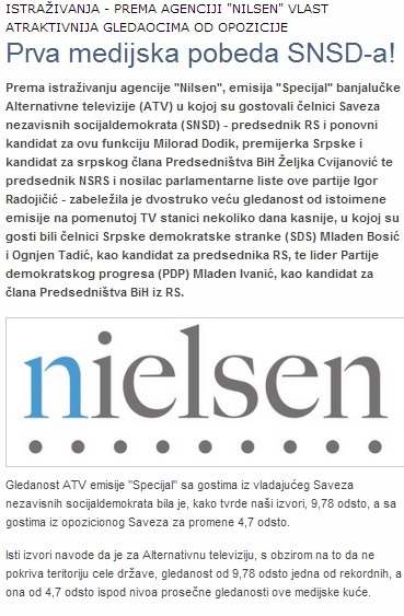 U SNSD-u su se pobrinuli i za moj naredni sadržaj. Nekom je palo na pamet da prema navodnoj gledanosti dvije televizijske emisije, učesnike jedne od njih proglasi pobjednicima. Sve je to sa fancy logotipom upakovano i objavljeno kao „medijska pobjeda“ . Podatak koji se nudi naprosto je nedovoljan za zaključak koji slijedi. Izvor: pressrs.ba