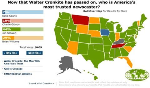 2009. godine, nakon smrti Waltera Cronkitea, u čijoj je zaostavštini nezvanična titula “novinara kojem se najviše vjerovalo”, online anketa magazina Time je pitala gledaoce da izaberu televizijskog izvještača kome se trenutno najviše vjeruje. Milionski auditorijum je zaobišao voditelje večernjih dnevnika na nacionalnim mrežama i odabrao Jona Stewarta s kablovskog kanala Comedy Central.