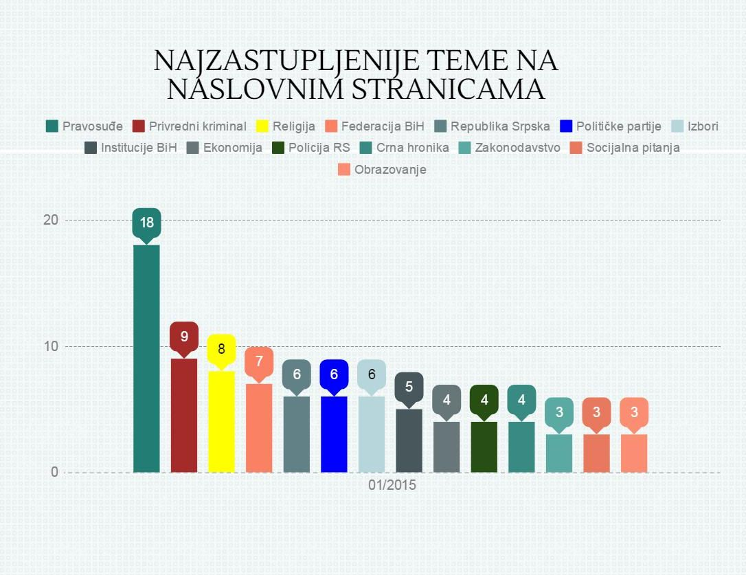 Uz sve to, već tradicionalno je visok interes novinara za političke teme od entiteta do političkih stranaka. Religijske teme i dalje su visoko vrednovane na naslovnicama naših novina. Čak osam puta glavni prostor je posvećen religiji.