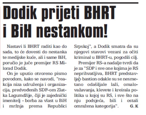 „Nastavi li BHRT raditi kao do sada, to će dovesti do nestanka te medijske kuće, ali i same BiH“, poručio je [tadašnji] premijer RS Milorad Dodik, piše Oslobođenje.
